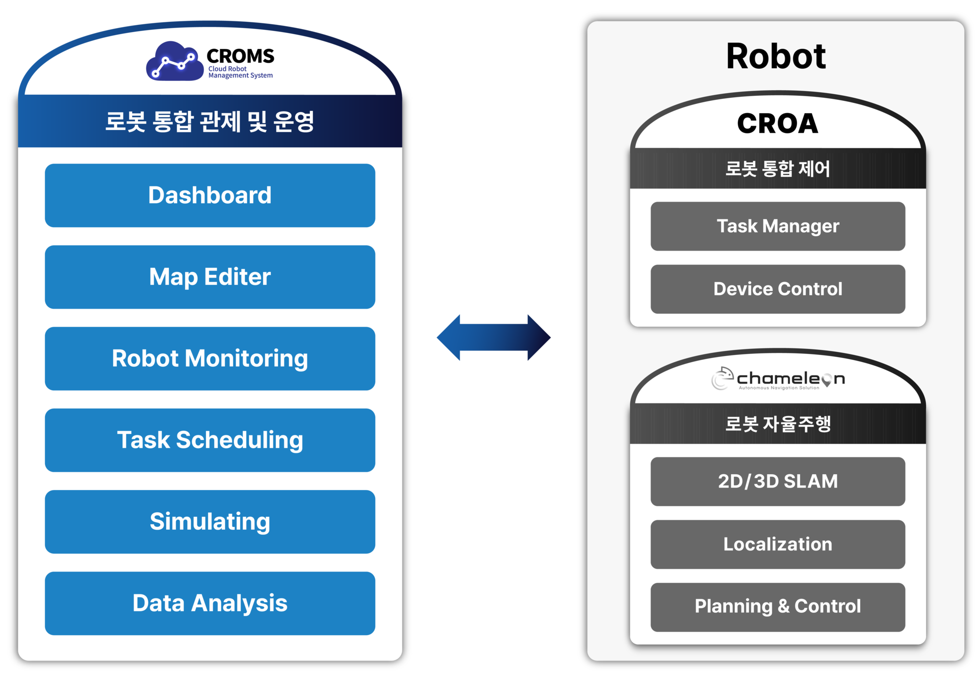 * 크롬스(CROMS): 이기종 로봇 통합 관제 시스템. 서로 다른 브랜드의 로봇 수십 대를 하나의 시스템에서 제어하고 모니터링할 수 있습니다.